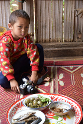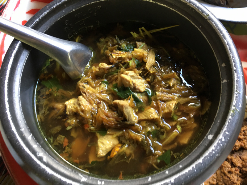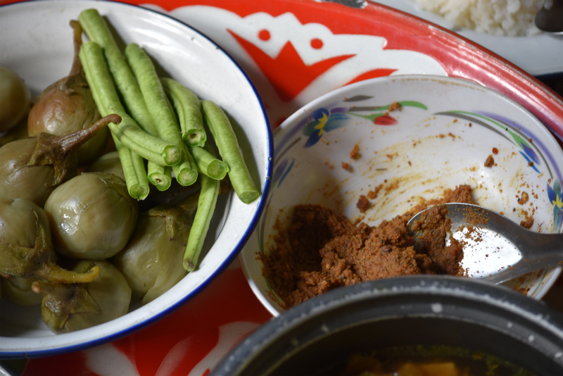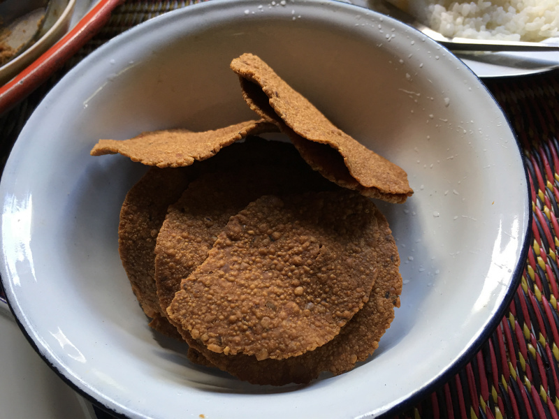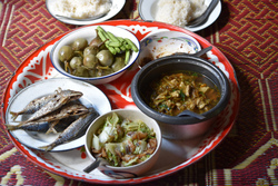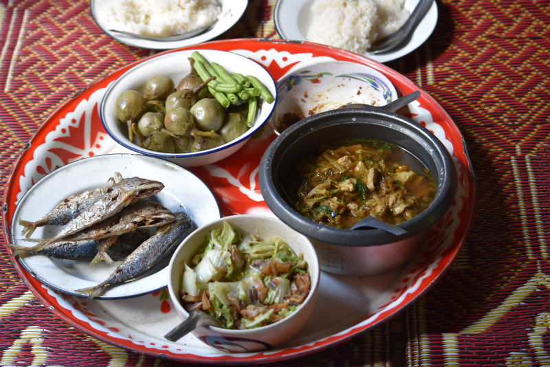 大好きなトゥアナーオという納豆を乾燥させたもののディップと、保存食の干し野菜などがたっぷり入ったスープ、お野菜、炒め物、魚などなど。