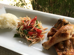 昼は、どうしても辛いものが食べたくなり、美味しいとタイ人から教えてもらった近所の屋台で、念願のガイヤーン(鶏の炭火焼)とソムタム(パパイヤサラダ)、そしてカオニャオ(もち米)という3種の神器じゃなくて神食(大袈裟)を買って食べました。