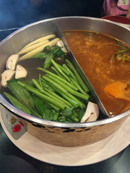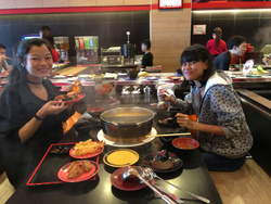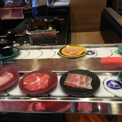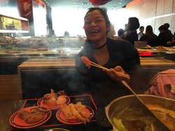 どこへ行きたいか聞いたら和食で回転するところ、、、。ニマンヘミンにあるメイヤーというビルに入っている「Shabu shi 」というところ、、、。日本のしゃぶしゃぶの回転寿司版で、どのお皿も値段は同じ。普通のスープとトムヤムクン味のスープを頼み、ビュッフェ形式の所から寿司や天ぷらみたいなものを山ほどもって来て、食べる食べる食べるプローイとダーウの二人。特にエビや貝は高くて普段食べることが出来ないので、集中的に、エビ、貝、肉を食べています。時々思い出したように、私に「何食べる?」と聞いてくれるので野菜ときのこを食べ続けていました。タレがピリ辛で結構美味しいのです。